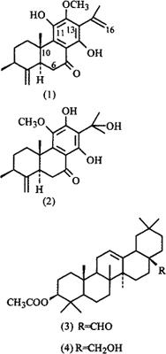 藿香根含山楂酸(Maslinic acid)、齐墩果酸(Oleanolie acid)、刺槐素(Acacetin)、刺槐素-7-O-β-D-葡萄吡喃糖甙(椴甙Tilianin)、藿香甙(Agastachoside)、胡萝葡甙(Daucosterol)、β-谷甾醇[1]、去氢藿香酚(Dehydroagastol)(1)[2]、3-O-乙酰基齐墩果酸[3]、3-O-乙酰基齐墩果醛(3-OAcetyloleanolic aldehyde)(3)、3-乙酰基高根二醇(3-O-Acetylery-throdiol)(4)及一个二萜化合物2,3,4,4a,10,10a-六氢-6,8-二羟基-7-(1-羟基-1-甲基乙基)-5-甲氧基-2,4a-二甲基-1-亚甲基-9(1H)-菲酮[2,4,5]。