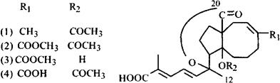 化学性质树皮含鞣质,多种有机酸,有上槿酸甲(1)、乙(2)、丙(3)、丙2(4)(Pseudolaric acid A,B,C,C2)是金钱松的抗真菌成分。其中土槿酸乙为主成分,并有抗生育活性[1]。又分得土槿酸甲甙及乙甙,前者是土槿酸甲的β-D葡萄糖酯甙[2,3]。