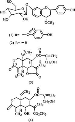 化学性质附 驱虫斑鸠菊(Vernonia anthelmintica Willd.)种子(新疆产)中得到10个化合物:对羟苯甲酰斑鸠菊黄烷甙(p-Hydroxy benzoylvernovan)(1)、斑鸠菊黄烷甙(Vernovan)(2)、斑鸠菊大苦素(Vernodalin)(3)、斑鸠菊醇(Vernodalol)(4)、3,4,2′,4′,5′-五羟基-6′-甲氧基-2-甲基查耳酮(3,4,2′,4′,5′-Pentahydroxy-6-methoxy-2-methyl chalcone)、β香树脂醇(β-Amyrin)、胡萝卜甙(β-Sitosterol-β-D-glucoside)、斑鸠菊酸(Vernolicacid)、豆甾醇(Stigmasterol)[1]。