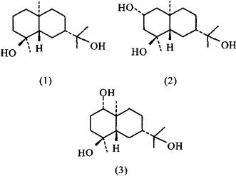 化学性质从全草中分离和鉴定了14个化合物。其中有3个新成分。为臭灵丹二醇(Pterodondiol,4β,11-二羟基-对映-桉烷)(1)、臭灵丹三醇甲(PterodontriolA,2α,4β,11-三羟基-对映-桉烷)(2)和臭灵丹三醇乙(PterodontriolB,1α,4β,11三羟基-对映-桉烷)(3)。