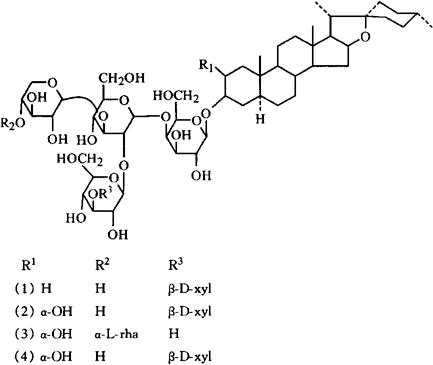 鲜花中含甾体糖甙[2]。它们是Tigogenin-3-0-β-D-xylopyranosyl-β-lycotetraoside(1)、Girogenin-3-O-β-D-xylopyranosyl-β-lycotetraoside(2)、Gitogenin-3-O-α-L-rhamnopyranosyl-β-lycotetraoside(3)、Prototype ot gitogenin-3-O-β-D-xylopranosyl-β-lycotetraoside(4)。