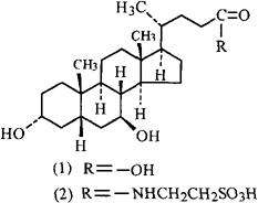 化学性质熊胆胆汁中主要含有胆汁酸类成分:胆酸(Cholic acid)、鹅去氧胆酸(Chenodeoxycholic acid)、熊去氧胆酸(Ursodeoxycholic acid)(1)、去氧胆酸(Deoxycholic acid)、牛磺熊去氧胆酸(Tauroursodeoxycholic acid)(2)、牛磺鹅去氧胆酸(Taurochenodeoxycholic acid)、牛磺胆酸(Taurocholic acid);有的胆汁还含微量的牛磺去氧胆酸(Taurodeoxycholic acid)或甘氨熊去氧胆酸。熊去氧胆酸是熊胆的特有成分,可以作为鉴别药用熊胆的依据;熊胆含有的胆色素类以胆红素为主,另外尚含胆黄素,胆褐素;熊胆中所含氨基酸类是以蛋白质形式存在,经处理后可测出赖氨酸、天冬氨酸、苏氨酸、牛磺酸等4~12种氨基酸;熊胆中尚含胆固醇、脂肪、磷质、无机盐和水等成分。