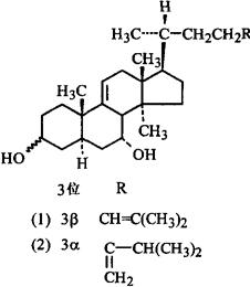 化学性质含淀粉69.6%~73.7%、蛋白质1.75%~2.30%、脂类0.47~0.68[1,2,3]。氨基酸[4,5]、有机酸[6]、草酸[7]、植酸盐[8]、甾醇[9]、胡萝卜素[10]、多糖[11]、α-半乳糖甙酶(α-Galactosidase)、氰甙[1]、原维生素A[12]、维生素B1、B2[13]、PP、烟酸、喹啉酸、胡芦巴碱(Trigonelline)[14]、维生素C[15],微量元素Ca、P、Zn、Cu、Mn、Mg、Na、K[16,17]等。并含二个新的双羟基甾醇(Dihydroxysterols)即14α-Methyl-5α-cholesta-9,24-diene-3β,7α-diol(1)和14α-Methyl-24-methylene-5α-cholesta-9,24-diene-3α,7α-diol(2)[18]。