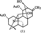 化学性质含生物碱类成分有:次乌头碱(Hypoconitine),含量约为0.011%,异构异叶乌头碱(Atisine)、关附甲素(1)、乙素、丙素、丁素、戊素、己素、庚素、辛素、壬素(Guan-fu baseA,B,C,D,E,F,G,H,I,)关附Z素(Guanfu base Z),[1~9],其中关附y素(Guan-fu base y,Acorine,即关附壬素),关附甲素具有抗心律失常作用[10]。