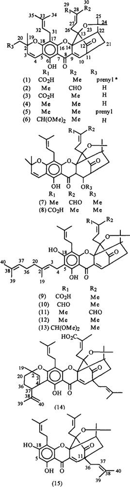 化学性质藤黄属植物分布越南、泰国、印度等热带地区,中国广东海南一带有引种;多含呫吨酮类(Xanthones)及双黄酮类化合物。如印支藤黄树(Garcinia hanburgi Hook.f.)及桑藤黄树(G.morella Desr.)的树干,经割伤后流出的树脂,干燥后商品称为藤黄(Gamboge)。中药“藤黄”中树脂占70%~80%,树胶占15%~25%;除药用外,常作为绘画黄色画料[1]。藤黄中的呫吨酮类化合物多有抗Hela及HEL细胞毒活性;其中主成分为藤黄酸(Gambogic acid,α-Gambogic acid,β-Guttiferin)(1)、其余有异桑藤黄素(Isomorellin)(2)、桑藤黄酸(morellic acid)(3)、Desoxymorellin(4)藤黄精(Gambogin)(5)、Morellin dimethyl acetal(6)、IsomoreollinB(7)、Moreollic acid(8)、Gambogenic acid(9)、藤黄精宁(Gambogenin)(10)、Isogambogenin(11)、Desoxygambogenin(12)、Gambogenin dimethyl acetal(13)、Gambogic acid(14)、Hanburin(15)[2,3]。又曾得到新藤黄酸(Neogambogic acid),即3,4二氢藤黄酸[4,5]。