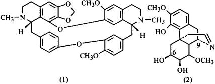 化学性质含酚性生物碱约2.5%,非酚性生物碱1.75%。从中分离出头花千金藤碱(Cepharanthine)(1)、头花千金藤酚碱(Cepharanoline)、头花千金藤胺碱(Cepharanine)、轮环藤碱(Cycleanine)、异粉防己碱(Isotetrandrine)、小檗胺(Berbamine)、高阿莫林(Homoaromoline),水溶性部分含有与木兰碱(Magnoflorine)、轮环藤酚碱(Cyclanoline)相对应的斑点[1~3]。还有粉防己碱、三叶防己碱。
