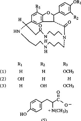 麻黄根中得到大环精胺类的麻黄根定碱(麻黄根素,Ephedradine)A(1)、B(2)、C(3)、D(4),阿魏酰组胺(Feruloylhistamine),均具降压活性[2~4];麻黄根中分出的麻黄根碱(麻黄根宁,麻根素,Maokonine,LTyrosine betaine)(5),具有升压活性[5];另外,麻黄根中含有的黄酮醇黄烷醇双分子化合物麻黄根宁A(Ephedrannin A)[6]及多种双黄烷醇类化合物麻黄宁(Mahuannin)A、B、C、D,亦具降压活性[7~10]。