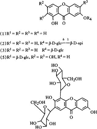 酮(Euxanthone)(1)、乌棒子甙甲(2)、乙(3)、丙(4)(WubangzisideA,B,C)、芒果甙(Mangifenn)(5)和豆甾醇葡萄糖甙(Stigmasteryl-β-D-glucoside)[2,3]。