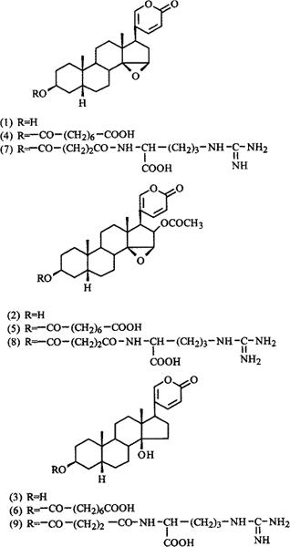 ①蟾毒配基类(Bufogenins):此类成分研究的较早,有的可能是蟾酥采收加工过程中的产物。用中国商品蟾酥为研究原料,已发现有:脂蟾毒配基(Resibufagenin)(1)、华蟾毒精(Cinobufagin)(2)、蟾毒灵(Bufalin)(3)、蟾毒它灵(Bufotalin)、华蟾毒它灵(Cinobufotalin)[3]、南美蟾毒精(Marinobufagin)、[4]另有学者从商品蟾酥50g中,分得脂蟾毒配基28g,蟾毒灵1.2g,华蟾毒精1.7g,其它3.7g[5]。脂蟾毒配基(Resibufogenin)商品称“蟾立苏”用于手术期间低血压、体克多种原因引起的中枢性呼吸抑制或呼吸衰竭;蟾毒灵(Bufalin)局麻作用较好[6]。 ②蟾蜍毒素类(Bufotoxims):此类化合物是蟾毒配基的脂肪酸酯、脂肪酰氨基酸酯及硫酸酯类物质。商品蟾酥中有:脂蟾毒配基、华蟾毒精和蟾毒灵各自的3-单辛二酸酯(Resibufogenin、Cinobufagin and Bufalin-3-hydrogen Suberate)(4、5、6)[7]以及它们的-3-丁二酰精氨酸酯(-3-succinoylarginine esters)(7、8、9)等[8]。 ③蟾蜍色胺类(Bufotenines):此在化合物具吲哚环有:5羟色胺(Serotonine)、蟾蜍色胺(Bufotenine)、蟾蜍特尼定(Bufotenidine)[5]。 ④其它成分:蟾酥中还有胆甾醇(Cholesterol)、麦角甾醇(Ergosterol)、菜油甾醇(Campesterol)、β-谷甾醇、γ-谷甾醇,粘液质、有抗酸、氨基酸等[3,5]。