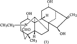 附 ①从小白撑(Aconitum nagarum var.heterotrichum)根中分得:光翠雀碱(Denudatine)、宋果灵(Songorine)、乌头碱(Aconitine)、去氧乌头碱(Deoxyaconitine)、滇乌碱(Yunaconitine)[17]。 ②伏毛铁棒锤(AconitumflavumH.-M.):根含乌头碱(Aconitine)、3-乙酰乌头碱(3-Acetylaconitine)[1,2]、黄乌头碱(拟)(Flaconitine)[3]、伏乌头碱(Flavaconitine)[4]、伏乌头明(拟)(Flavamine)(1)、伏乌头定(拟)(Flavadine)[5]、中乌头碱(Mesaconitine)、海帕乌头碱(次乌头碱、Hypaconitine)[6]、N-乙酰伏乌头碱(N-Acetylflavaconitine)[7]、去氧欧乌头碱(Dehydronapelline)、1-表欧乌头碱(1-Epinapelline)、12-表欧乌头碱(12-Epinapelline)、12-乙酰稍光乌头碱(拟)(12-Acetyllucidusculine)、1-去甲基海帕乌头碱(1-去甲基次乌头碱,1-Demethylhypaconitine)、欧乌头碱(Napelline)、稍光乌头碱(拟)(Lucidusculine)、去氧乌头碱(Deoxyaconitine)、苯甲酰乌头胺(Benzoyl-aconine)、尼奥林(Neoline)[8,9]。 ③皱叶乌头(Aconitum nagarum Stapf var.heterotrichum Fletcher et Lauener):块根含宣乌碱(即小白撑碱、Nagarine)、乌头碱(Aconitine)、3-去氧乌头碱(3-Deoxyaconitine)[15]。