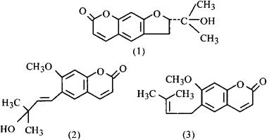化学性质根含β-谷甾醇、香豆素类化合物:印度楹桲素(Marmesin)(1)、苏白任酮(Suberenol)(2)、软木花椒素(Suberosin)(3)、7-甲氧基-6(2,3-环氧-6-甲基丁基)香豆素〔7-Methoxy-6-(2,3-epoxy-6-methylbutyl)coumarin〕。