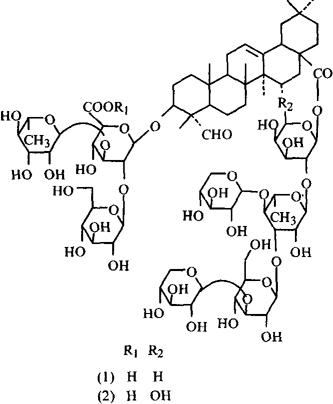化学性质种子含由丝石竹皂甙元(Gypsogenin)构成的皂甙苦瓜皂甙I(Momordica saponin I)(1)和由皂树酸(Quillaic acid)构成的皂甙苦瓜皂甙Ⅱ(Momordica saponin Ⅱ)(2),在植物体内以羧酸盐形式存在[1]。