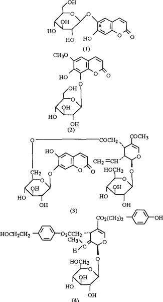 ¸½ °×À¯Ê÷ÏÊÒ¶Öк¬éÏé¿àß°(Oleuropein)¡¢ÐÂéÏé¿àß°(Neooleuropein)¡¢¾ÕÜÄß°(Cichoriin)¼°°×À¯Ê÷ß°(Frachinoside)(3)[5]¡£Ì¨Íå°×À¯Ê÷F£®formosanaÏÊÒ¶Öк¬Å®Õêß°(Ligustroside)¡¢ÒìÅ®Õêß°(lsoligustroside)ºĮ́Íå°×À¯Ê÷ß°(Fraxiformoside)(4)[6]¡£