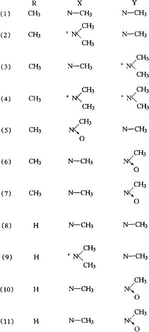 化学性质主含生物碱:粉防己碱(Tetrandrine)(1)、防己诺林碱(Fangchinoline)(8)、轮环藤酚碱(Cyclanoline)、2-N-甲基粉防己碱(2-N-Methyltetrandrine)(2)、2’-N-甲基粉防已碱(3)、2,2’-N,N-二甲基粉防己碱(4),2- N-甲基防己诺林碱(9)[3]、粉防己甲素(5)、乙素(10)、丙素(11)、丁素[1](FenfangjineA,B,C,D)、氧化防己碱(Oxofangchirine)[2]、轮环藤碱(Cyclanine)、防己菲碱(Stephenanthrine)、防己AA-1(Alkaloid AA-1)、木兰碱(Magnoflorine)、Oblongine。另有2’-N-α氧粉防己碱(Tetrandrine-2’-N-α-oxide)(6)、2’-N-β氧粉防己碱(7)。后二者和粉防己甲素、乙素、丙素均为氮氧化合物。还含有β-谷甾醇及棕榈酸。此外,分到2,2’-N-N-二氯甲基粉防己碱(2,2’-N-N-Dichloromethyl-tetrandrine)为用二氯甲烷溶剂的后生产物[4]。