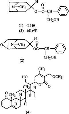 化学性质含莨菪碱(Hyoscyamine,天仙子胺)(1)、东茛菪碱(Scopolamine即天仙子碱,Hyoscine)(2)、去甲基莨菪碱[1]、阿托品(Atropine)(3)[2]、甾体[3]、曼陀罗酮(Daturaolone)、曼陀罗二醇(Daturadiol)[4]、白曼陀罗太灵(Daturametelin)A、B[5]、C(4)、D、E、F,Daturametelin G酰化物[6]。毛曼陀罗子含天仙子胺(莨菪碱)、天仙子碱(即东莨菪碱)[2]、香曼陀罗碱(Meteloidine)、曼陀罗二醇(Daturadiol)、曼陀罗酮(Daturaolone)、油酸、亚油酸[7,8]、(欧)曼陀罗子含阿托品、天仙子碱(东莨菪碱)、托品碱[2]、甾体[3]、去水阿托品、惕各假托品(Tigloidine)、曼陀罗碱、莨菪碱(天仙子胺)、3α,6β-Ditigloyloxytropane、3α,6β-Ditigloyloxytropane-7β-ol[9]、萤光曼陀罗亭(Fluorodaturatine)、高萤光曼陀罗亭(Homofluorodaturatine)[10]、外源凝集素(Lectin)[11]、N-乙酰-D-氨基葡糖结合型外源凝集素[12]。紫花曼陀曼子中主含生物碱,有阿托品、天仙子碱(东莨菪碱)等[2]。