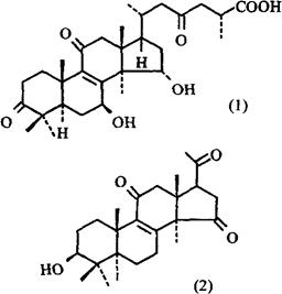 灵芝含麦角甾醇、树脂、脂肪酸、甘露醇、多糖[3],生物碱、内酯、香豆精、水溶性蛋白质[4],无机离子(Fe+++,K+)、香豆素甙、挥发油、维生素B2、维生素C[5],r-氨基酸、甘氨酸、丙氨酸[2]、胱氨酸、酪氨酸、亮氨酸、谷氨酸、γ-氨基丁酸[6],十九烷酸、二十二烷酸、二十四烷酸、棕榈酸、二十四烷、三十一烷[8,9]、硬脂酸、苯甲酸[2]、胆碱、甜菜碱、β-谷甾醇[8,9]、β-(1→6)(1→3)葡聚糖[6]、β-(1→6)(1→3)甙键阿拉伯半乳聚糖[7]、由葡萄糖和阿拉伯糖组成的肽多糖(葡萄糖:阿拉伯糖=4:1)[6]、灵芝酸A(Ganoderic acid A)(1)[10~12]、灵芝酸B[10,11,13]、灵芝酸C[12~14]、灵芝酸甲酯D(Methyl ganoderate D)[12,15]、灵芝酸甲酯E(Methyl ganoderate E)[15~17]、灵芝酸甲酯F(Methyl ganoderateF)[15,16]、灵芝酸甲酯G(Methyl ganoderate G)[16,18]、灵芝酸甲酯H(Methyl ganoderate H)[15]、灵芝酸甲酯I(Methyl ganoderate I)[18]、灵芝酸甲酯J(Methyl ganoderate J)[19,20]、灵芝酸K(Ganoderic acidK)[21]、灵芝酸甲酯L(Methyl ganoderate L)[22]、灵芝酸甲酯M(Methylganoderate M)、灵芝酸甲酯N(Methyl ganoderate N)、灵芝酸甲酯O(Methyl ganoderateO)[23]、灵芝酸甲酯K2(Methyl ganoderate K2)、化合物B8(C31H48O7)、化合物B9(C31H50O7)[20]、灵芝酸C2(Ganoderic acid C2)[12,20,24]、灵芝烯酸A(Ganoderenic acid A)、灵芝烯酸B(Ganoderenic acid B)、灵芝烯酸C(Ganoderenic acid C)、灵芝烯酸D(Ganoderenic acid D)[16]、赤灵芝酸甲酯A(Methyl ganolucidate A)、赤灵芝酸甲酯B(Methyl ganolucidate B)[18,25]、赤灵芝酸甲酯C(Methyl ganolucidate C)[19]、赤灵芝酸甲醋D(Methyl ganolucidate D)[22]、灵芝酸Ma(Ganoderic acid Ma)、灵芝酸Mb(Ganoderic acid Mb)、灵芝酸Mc(Ganoderic acid Mc)、灵芝酸Md(Ganoderic acid Md)[26]、灵芝酸Mg(Ganoderic acid Mg)、灵芝酸Mh(Ganoderic acid Mh)、灵芝酸M1(Ganoderic acid Mt)、灵芝酸Mj(Ganoderic acid Mi)[27]、灵芝酸U(Ganoderic U)、灵芝酸V(Ganoderic acid V)[28]、灵芝酸W(Ganoderic acid W)[26,28]、灵芝酸Z(Ganoderic acid W)[28]、灵芝醇G(Ganoderiol G)、灵芝醇H(Ganoderiol H)、灵芝醇I(Ganoderiol I)、双乙酰灵芝醇C(Diacetate ganoderiol C)、双乙酰灵芝醇D(Diacetate ganoderiol D)、双乙酰灵芝醇E(Diacetate ganoderiol E)、赤灵芝酸E(Ganolucidic acid E)[29]、3β,15α-Diacetoxylanosta8,24-dien-26-oic acid[30]、灵芝醛B(Ganoderal B)[31]、环氧灵芝醇A(Epoxyganoderiol A)[31,32]、灵芝酸Me(Ganoderic acid Me)、灵芝酸Mf(Ganoderic acid Mf)[26]、灵芝酸P(Ganoderic acid P)[33]、灵芝酸Q(Ganoderic acid Q)[27,33]、灵芝酸R(Ganoderic acid R)[26,34]、灵芝酸S1(Ganoderic acid S1)[21]、灵芝酸S2(Ganoderic acid S2)[34]、灵芝酸T(Ganodenc acid T)[26,34]、灵芝酸X(Ganoderic acid X)、灵芝酸Y(Ganoderic acid Y)[28]、灵芝醇F(Ganoderiol F)[29]、灵芝单醇A(Ganoderol A)、灵芝单醇B(GanoderolB)[21,35]、灵芝醇B(Ganoderiol B)[35]、Ganodermatriol、灵芝醇A(Ganoderiol A)、Ganodermanontriol[36]、Ganodermanondiol[37]、灵芝醛A(Ganoderal A)[21],环氧灵芝醇B(Epoxyganoderiol B)、环氧灵芝醇C(Epoxyganoderiol C)[29,31]、3α,5α,22α-二羟基羊毛甾-7,9(11),24-三烯-26-酸(3α,5α,22α-Trihydroxylanosta-7,9(11),24-trien-26-oic acid)、3β,15α,22α-三羟基-7,9(11),24-三烯-26-酸(3β,15α,22α-Trihydroxylanosta-7,9(11),24-trien-26-oic acid)、3α,15α-二乙酰氧-22α-羟基羊毛甾-7,9(11),24-三烯-26-酸(3α,15α-Diacetoxy-22α-hydroxylanosta-7,9(11),24-trien-26-oic acid)、3β,15α-二乙酰氧-22α-羟基羊毛甾-7,9(11),-24三烯-26-酸(3β,15α Diaacetoxy-22α-hydroxylanosta-7,9(11),24-trien-26-oic,acid)、22β-乙酰氧-3β,15α-二羟基羊毛甾-7,9(11),24-三烯-26-酸(22β-Acetoxy-3β,15α-dihydroxylanosta-7,9(11),24-trien-26-oic acid)、22β-乙酰氧-3α,15α-二羟基羊毛甾-7,9(11),24-三烯-26-酸(22β-Acetoxy-3α,15α-dihydroxylanosta-7,9(11),24-trien26-oic acid)[30]、羊毛甾7,9(11)24-三烯-3α,15α-二羟基-26-酸(Lanosta7,9(11),24-trien-3α,15α-dihydroxy-26-oic acid)、羊毛甾-7,9(11),24-三烯-15α,22β-二乙酰氧-3β-羟基-26-(Lanosta-7,9(11),24-trien-15α,22β-acetoxy-3β-hydroxy-26-oic acid)、羊毛甾-7,9(11),24三烯3β,15α-二羟基-26-酸(Lanosta-7,9(11),24-tnen-3β,15α-dihydroxy-26-oic acid)[38]、羊毛甾-7,9(11),24-兰烯-3α-乙酰氧-15α,22β-二羟基-26-酸-(Lanosta-7,9(11)-trien-3α-acetoxy-15α,22β-dihydroxy-26-oic acid)、羊毛甾-7,9(11),24-三烯-3β,15α,22α-三乙酰氧-26-酸(Lanosta-7,9(11),24-trien-3β,15α,22α-triacetoxy-26-oic acid)、羊毛甾-7,9(11),24-三烯-15α-乙酰氧-3α-羟基-23-氧代-26-酸(Lanosta-7,9(11),24-trien-15α-acetoxy3α-hydroxy-23-oxo-26-oic acid)、羊毛甾-7,9(11),24-三烯-3α,15α-二乙酰氧-23-氧代-26-酸(Lanosta-7,9(11),24-trien2α,15α-diacetoxy-23-oxo26-oic acid)、羊毛甾-7,9(11),24-三烯-3α-乙酰氧-15α-羟基-23-氧代-26-酸(Lanosta-7,9(11),24-trien-3α-acetoxy-15α-hydroxy-23-oxo-26-oic-aicd)[39]、赤芝酸A(Lucidenic acid A)、赤芝酸B(Lucidenic acid B)、赤芝酸C(Lucidenic aicd C)[13,14]、赤芝酸D(Lucidenic aicd D)[15,16]、赤芝酸甲酯E(Methyl lucidenate E)[15]、赤芝酸甲酯F(Methyl lucidenate F)[15,20]、赤芝酸D1(Lucidenic acid D1)[20,31],赤芝酸E1(Lucidenic acid E1)[24]、赤芝酸甲酯E2(Methyl lucidenate E2)[20,23,31]、赤芝酸甲酯K(Methyl lucidenate K)、赤芝酸甲酯L(Methyl lucidenate L)、赤芝酸甲酯M(Methyl lucidenate M)[23,31]、赤芝酸甲酯G(Methyl lucidenate G)[22,31]、赤芝酸甲酯H(Methyl lucidenate H)、赤芝酸甲酯I(Methyl lucidenate I)、赤芝酸甲酯J(Methyl lucidenate J)[23,31]、赤芝酮A(Lucidone A)(2)、赤芝酮B(Lucidone B)[40,41]、赤芝酮C(Lucidone C)[22]。菌丝含糖类(还原糖、多糖)、胺类、肚类、酰胺类、蛋白质、皂甙、生物碱、类脂、挥发油、花青素类、酯酶、麦芽糖酶、漆酶、蔗糖酶、淀粉酶、棉子糖酶、凝