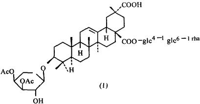 化学性质树皮含异叶梁王茶甙Ⅰ{Yiyeliangwanoside Ⅰ,3-O-α-(3’,4’-O-二乙酰基)-L-吡喃阿拉伯糖-3β-羟齐墩果-12-烯-28,29-双羧酸-28-O-〔α-L吡喃鼠李糖(1→6)-β-D-吡喃葡萄糖(1→4)-β-D-吡喃葡萄糖〕酯甙(1)、异叶梁王茶甙Ⅱ〔3-O-α-(3’-O-乙酰基)-L-吡喃阿拉伯糖-3β-羟齐墩果-12-烯-28,29-双羧酸甙〕[1]、异叶梁王茶甙Ⅲ{3-O-α-(2’,4’O-二乙酰基)-L-吡喃阿拉伯糖-3β-羟基齐墩果-12-烯-28,29-双羧酸-28-O〔α-L-吡喃鼠李糖(1→4)-β-D-吡喃葡萄糖(1→6)-β-D-吡喃葡萄糖〕酯甙、异叶梁王茶甙Ⅳ〔3-O-β-(2-O-乙酰基)-D-吡喃木糖-3β-羟齐墩果-12-烯-28,29-双羧酸甙〕[2]。