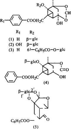 化学性质根含芍药甙(Paeoniflorin)(1)3.3%~5.7%[1,2]、少量羟基芍药甙(Oxypaeoniflorin)(2)、苯甲酰芍药甙(Benzoylpaeoniflorin)(3)、芍药内酯甙(Albiflonn)(4)[2~4]、芍药新甙(Lactiflorin)(5)、(Z)-(1S,5R)-β-蒎烯-10基-β巢菜糖甙[(Z)-(1S,5R)-β-Pinen-10xy-β-vicianoside)[5,6]。芍药新甙可能即芍药甙的后生产物[7]。另含苯甲酸、没食子酸、没食子酸甲酯、葡萄糖没食子酸(Glucogallin)、儿茶素(d-Catechin)、棕榈酸、中肌醇(Myo-inositol)、β-谷甾醇及其甙(Daucosterol)[6]。尚含挥发油、粘液质、蛋白质[8]8。