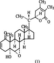 化学性质全草含假酸浆素(假酸浆甙苦素,Nicandrin)0.65%。叶含假酸浆烯酮(Nicandrenone)、魏察假酸浆素(Withanicandrin),叶还含谷甾醇,菜油醇、异岩藻甾醇、胆甾醇、豆甾醇、24-亚甲基胆甾醇和芸苔甾醇[2]。从叶的水提液中分到17个化合物Nic 1~17,其中Nic1,2,3,7,10,11,12,17的结构已经确定[3~7],Nic1即假酸浆烯酮。根含托品酮(Tropinone)、古豆碱(Hygrine)[1]。从种子得曼陀罗内酯2(Daturalactone 2)[8]。从脱脂种子分得新化物假酸浆素B(Nicandrin B,C28H38O6) 1),为一新的C28-甾体内酯[9]。