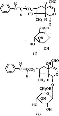 附 叶含环烯醚萜甙类物质:凌霄花甙(Campsiside)(1)[2,3]、5-Hydroxycampsiside、Campneoside Ⅰ、Campneoside Ⅱ、5-羟基凌霄恩甙(5-Hydroxycampenoside)(2)、洋丁香甙(Acteoside)、β-Hydroxyacteoside、Tecomoside、Cachineside Ⅰ[3]、CachinesideⅢ、Ⅳ、V[4]。