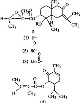 从地上部分得3-O-(2′,3′-环氧-2′-甲基丁酰)香阔苞菊酮[3-O-(2′,3′-Epoxy-2′-methylbutyroyl)-cuauhtemone](1)及其甲酸酯(2)和乙酸酯(3),5-去氧长裂蒿醇(5-Desoxylongilobol,即Dihydroxyeudesmene),3-甲氧基-4-乙酰氧基肉桂醇当归酸酯,以及化合物6S-羟基香芹艾菊酮当归酸酯(4)(6S-Hydroxycaryotanacetone angelate)[3]。