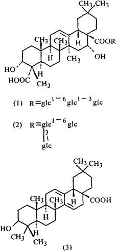化学性质含氨基酸、有机酸、皂甙、三萜[1]。主含五环三萜皂甙,水解后得多种皂甙元[2];从皂甙中已分离到金铁锁皂甙Ⅰ(1)及金铁锁皂甙Ⅱ(2),均为齐墩果烷型皂甙,母核配基相同,但糖的连接位置不相同,甙元及甙均为新化合物[3]。从根中还分到另一新甙元:3-羟基-12,14-二烯-27-去甲齐墩果烷-28-酸(3)[4]。
