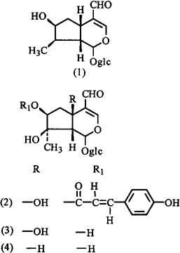 近年来,从叶中尚分得凌霄花甙Ⅰ、Ⅲ、Ⅳ、V(Cachineside Ⅰ、Ⅲ、Ⅳ、V)(1~4)、5-羟基凌霄烯甙(5-Hydroxycampenoside)、黄钟花甙(Tecomo-side)[2,3];凌霄乃甙Ⅰ(Campneoside Ⅰ)、凌霄乃甙Ⅱ(即β-羟基洋丁香甙)、洋丁香甙(Acteoside)[4]、凌霄烯甙(Campenoside)[5]凌霄甙(Campsiside)、5-羟基凌霄甙(5-Hydroxycampsiside,即Pondraneoside)以及肉苡蓉碱(Boschniakine)[6]。