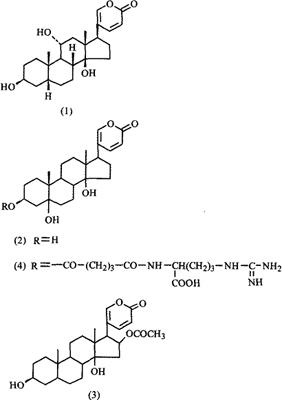 附:从我国台湾产曼谷蟾蜍B、bankorensis Borbour的皮中得到海蟾毒精-3-丁二酰基-L-精氨酸酯(Marinobufagin-3-succinyl-L-arginine ester)、海蟾毒精-3-戊二酰基-L-精氨酸酯(Marinobufagin-3-glutaryl-Larginine ester)、远华蟾毒精-3-戊二酰基-L-精氨酸酯(Telocinobufagin-3-glutaryl-L-arginine ester)(4)、蟾毒灵(Bufalin)、脂蟾毒配基(Resibutogenin)、沙蟾毒精(Arenobufagin)、蟾毒它灵(Bufotalin)、远华蟾毒精(Telocinobufagin)(2)、海蟾毒精(Marinobufagin)、日蟾毒它灵(Gamabufotalin)[7]。