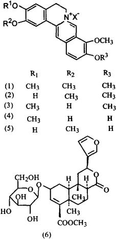 化学性质块根含防己内酯(Columbin)、异防己内酯(Isocolumbin)及其葡萄糖甙-金果榄甙(Tinoside)[1]、掌叶防己碱(巴马汀,Palmatine)(1)、药根碱(Jatrorrhizine)(2)、非洲防己碱(Columbamine)(3)、Stepharanine(4)、Dehydrodiscretamine(5)、蝙蝠葛林碱(Menisperine)、木兰碱(Magnoflorine)[2],另含金果榄苦酮素A、B、C、D(Tinocallone A、B、C、D),表金果揽菲甙(Epitinophylloloside)(6),此类化合物为强苦味成分,多有免疫抑制作用[3]。