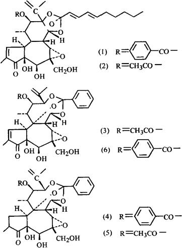 化学性质花蕾及花中共得到6种二萜原酸酯类成分:芫花酯甲(Yuanhuacin)(1)、芫花酯乙(Yuanhuadin)(2)、芫花酯丙(Yuanhuafin)(3)、芫花酯丁(Yuanhuatin)(4)、芫花酯戊(Yuanhuapin)(5)[1]和12苯甲酰氧基瑞香毒素(12-Benzoxydaphneioxin)(6)[2];4种黄酮类化合物:芫花素(Genkwanin)、芹菜素(Apigenin)、芫根甙(Yu-enkanin)、3’羟基芫花素(3’-Hydrox-ygenkwanin)[3],以及β-谷甾醇,苯甲酸等[4]。