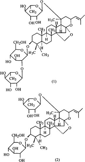 含皂甙(Saponin)A1、A2、B、C1、C2、D(1)、E、F、G(2)和H[1],近年来用碱裂解Saponin D,获得真正的皂甙元是酸枣仁皂甙元(Jujubogenin),并得到另一种皂甙20-O-α-L-Rhamnopyranosyljujubogenin[2],另尚含有水溶性的甜味成分枳椇素(H。dulcin),亦为三萜类皂甙,分解得到森林匙羹藤酸(Gymnemic acid)和Ziziphins[3]。