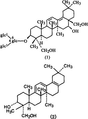 化学性质风轮菜含黄酮甙、皂甙、内酯、有机酸、酚性物质、糖类、树脂、蛋白质、无机盐、鞣质、氨基酸、香豆素等[1]。从风轮菜(C.chinense)地上部分分到香蜂草甙(Didymin)、橙皮甙[2]、芹菜素(Apigenin)、异樱花素(Isosakuranetin)和熊果酸[3]。从风轮菜和灯笼草(C.polycephalum)全草均分到新三萜皂甙:风轮菜皂甙A(ClinopodisideA)(1)、其化学名为-3-O-β-D-吡喃葡萄糖(1→6)-[β-D-吡喃葡萄糖(1→4)-β-D-吡喃葡萄糖]-11,13(18)-二烯-3β,16β,23,28-四羟基齐墩果烷[4,5]。灯笼草还含蒲公英赛-9,12,17-三烯-3β-23-二醇(Taraxer-9,12,17-triene-3β,23-diol)(2)[6]。
