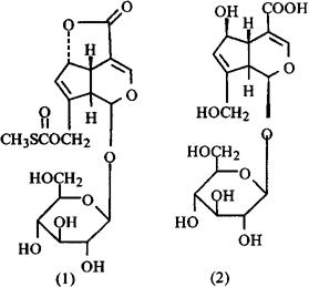 化学性质含鸡屎藤甙(Paederoside)(1)、鸡屎藤次甙(Scandoside)(2)、车叶草甙(Asperuloside)[1~3],γ-谷甾醇[4]。叶含熊果酚甙(Arbutin)0.86%[5],挥发油[6]。