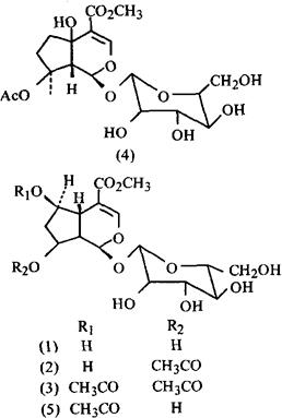 化学性质地上部分含多种环烯醚萜甙类:山栀甙甲酯(Shanzhiside methy ester)(1)、假杜鹃精(Barlerin,8-O-Acetylshanzhiside methyl eter)(2)、乙酰假杜鹃精(Acetylbarlerin,6,8-O,O-Diacetylshanzhiside methyl enter)(3)[1],少量的Ipolamidoside(4)和新化合物氧乙酰山栀甙甲酯(OAcetylshanzhiside methyl eter)(5)[2]。