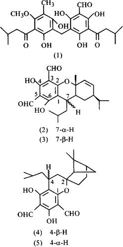 化学性质叶和顶生小枝平均出油率0.16%,挥发油中主含α-蒎烯、桉油精(C1-neole)、α-水芹烯(α-Phellandrene)、没食子酸(Gallic acid)[1]。其酚性成分中有多种黄酮体、鞣花酸、龙胆酸、咖啡酸和绿原酸等。叶中含有大叶桉酚甲(Robustaol A)(1)[2,3]、两种酚醛化合物Euglobal Ia1(2)和Euglobal Ia2(3),还有大叶桉二醛A(Robustadial A)(4)、大叶桉二醛B(Robustadial B)(5)。从叶中分得5-羟基-4’,7二甲氧基6.8-二甲氧基黄酮(Eucalyptin)、4’,5-二羟基-7-甲氧基-6,8-二甲基黄酮(Sideroxylin)、3β-羟基-乌索11-烯-28,13β-内酯、3β-乙酰氧基-乌索-11烯28,13β-内酯、3β,28-羟基-乌索12-烯(Uvaol)、β-谷甾醇、2甲基5,7-二羟基苯并吡喃酮-7β-葡萄糖甙、正卅烷醇和正卅烷酸及大叶桉酚乙(2-甲氧基-4,6-二羟基异丁酰基苯,Robustaol B)[4,6]。