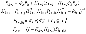 这个方程右端的第二项表示校正项,其中括号内的项称为新息。Kk+1 称为增益阵。因此卡尔曼滤波方法可直观表述为在一步最优预测估值的基础上增加新息校正。新息是由第k+1步观测决定的,其中包含由噪声引起的观测误差。增益矩阵 Kk+1对它有调节作用,当噪声很大时Kk+1的元会自动地取较小的值,反之则取较大的值。卡尔曼滤波的四个递推方程是: