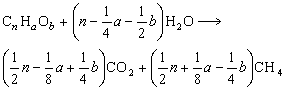 第一、二阶段又称为液化过程。第三阶段是在甲烷菌的作用下将第二阶段产生的挥发酸转化成甲烷和二氧化碳,因此又称为气化过程,其反应可用下式表示: