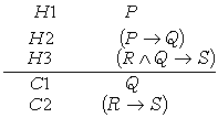 横线以下的C1,C2则是有待证明的结论。由H1,H2可推出C1(根据充分条件的假言推理原则),又根据H3和已推出的C1可推出C2。同样的例子如运用归结原理,其子句集可表示为