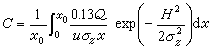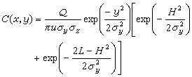 式中C(x,y)为地面上某一点污染物的浓度;Q为污染物单位时间排放量;u为在高度H的平均风速;σy为侧风方向上的标准离差,是x的函数;σz为垂直卷流标准离差,是x的函数;H为污染源的有效高度;x是顺风向坐标;y为侧风向坐标;z为垂直于风向坐标;L为对流层的高度(此方程对于H >L的情形是无效的)。