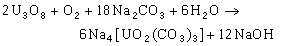 。浸出时常加入氧化剂氯酸钾或软锰矿,使四价铀变成六价铀,以利于浸出。分离不溶性残渣后,加氨沉淀出重铀酸铵。也可以将浸出液经过离子交换提纯后,再加氨沉淀。含碳酸盐或其他耗酸物质太多的铀矿石,采用碱法浸出。常用浸出剂有碳酸钠溶液或碳酸钠和碳酸氢钠的混合液。在鼓入空气的条件下,矿石中的铀与碳酸钠进行以下反应: