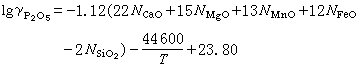 式中(P2O5)代表渣中的组分P2O5;N是渣中P2O5的摩尔分数;[%P]、[%O]是钢中磷和氧含量(重量百分数);γ是渣中P2O5的活度系数,其值可由下式计算:
