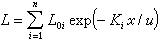 Li=L0iexp(-Kix/u) (1)式中Li为第i种污染物在污染源下游x距离处河水中的浓度(毫克/升);L0i为此种污染物刚进入水体时的初始浓度(毫克/升);u为河水的平均流速(公里/天);x为距离(公里);Ki为此种污染物在水体中的一级衰变系数(天-1)。如果在河水中存在多种可衰变的污染物,那么描述这些污染物总浓度的一级衰变模式就应是: