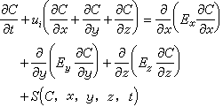 式中C为某种污染物在时间t时的浓度;ui为水流速度矢量(i=x、y、z);x、y、z为时间t时污染物在水体中所处的空间坐标;Ex、Ey和Ez分别为污染物x、y、z方向上的扩散系数(距离/时间);S(C,x,y,z,t)为此种污染物的来源或丢失(浓度/时间)。式(3)可以用来描述污染物在海水中的变化。如果是描述河口、地下水和深湖中污染物的变化,可以用二维水体模式,即在式(3)中将z方向的项目去掉。如果是描述河流中污染物的变化,可以用一维水质模式,即只考虑河水流动的方向。