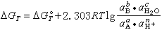 式中A、B分别为反应物与生成物;a、b、c、n均为化学计量系数。此反应的自由焓变量ΔGT可按下式计算: