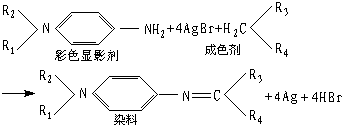 从式中的化学反应可看出,生成 1个染料分子需要还原4个银离子。这种成色剂叫做4当量成色剂。也有形成一个染料分子只需还原2个银离子的成色剂,叫做2当量成色剂。