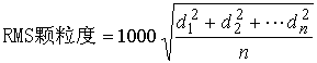 在发展过程中,曾出现过几种测量与表示颗粒度的方法。通用的公认比较好的方法是均方根颗粒度(RMS颗粒度)。这种方法是:将受测胶片用一系列不同曝光量均匀曝光,经显影后选取密度为1.0的样品,用测微密度计进行扫描测量,测量出1000个以上的数值后,算出所测密度的平均值,然后再算出每次测量与平均值之差,按照下式进行计算: