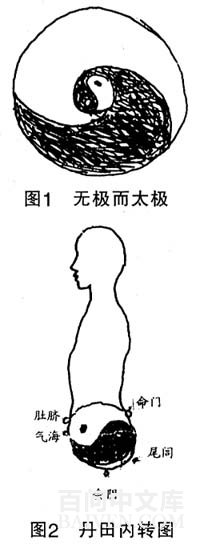 双鱼太极图(见图1中间部分)的白色部分为阳仪,其中一点属阴,乃阳中有阴;黑色部分为阴仪,其中一点属阳,乃阴中有阳。太极图在太极拳中的应用,主要即是在小腹部位——下丹田内以意行气,有如转动立体的太极球(见图2)。即向前向后,向左向右,向上向下,可逆可顺,可正可隅,从四面八方各个角度方位作任意引导,以配合拳势动作作太极球的转动。陈氏太极拳将此称之为丹田内转,杨氏太极拳称之为气沉丹田。