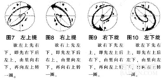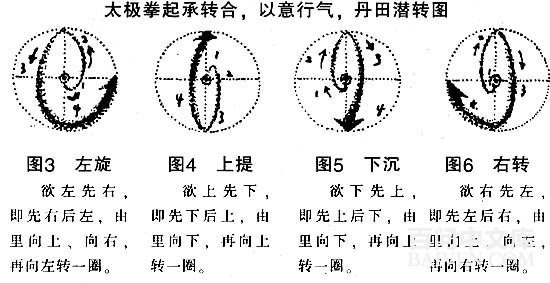 锻炼时以意行丹田真气,不外乎以下8种转换图式。若内气运行作左旋则如图3,直上提如图4,直下沉如图5,右转如图6,左上提如图7,右上提如图8,右下旋如图9,左下旋如图10。此8幅图合为一圆球整体图,是陈氏太极拳的传人陈照奎老师(1927—1981)所传授的丹田内转练习法。不过这一起承转合,在外形上是视之不见的,随着这一内意的走向来引导行功走架,使外形齐动的。