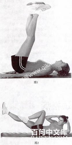 动作一垂直伸腿(图1)。仰卧在地板上,两腿向上伸直,膝盖交叉;收缩腹部,把肩胛骨提离地板,感觉好像要把你的胸腔移向脚部一样:两腿保持在一个固定的姿势,想像腹部压向脊椎的感觉;重复12~16次。