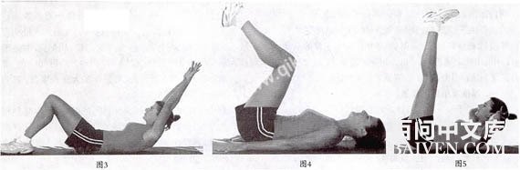 动作三伸臂收腹(图3)。躺在垫上,自然向头部后面伸直手臂,两手相扣,手臂贴着耳朵;收缩腹部,把肩胛骨向上提;重复12~16次。